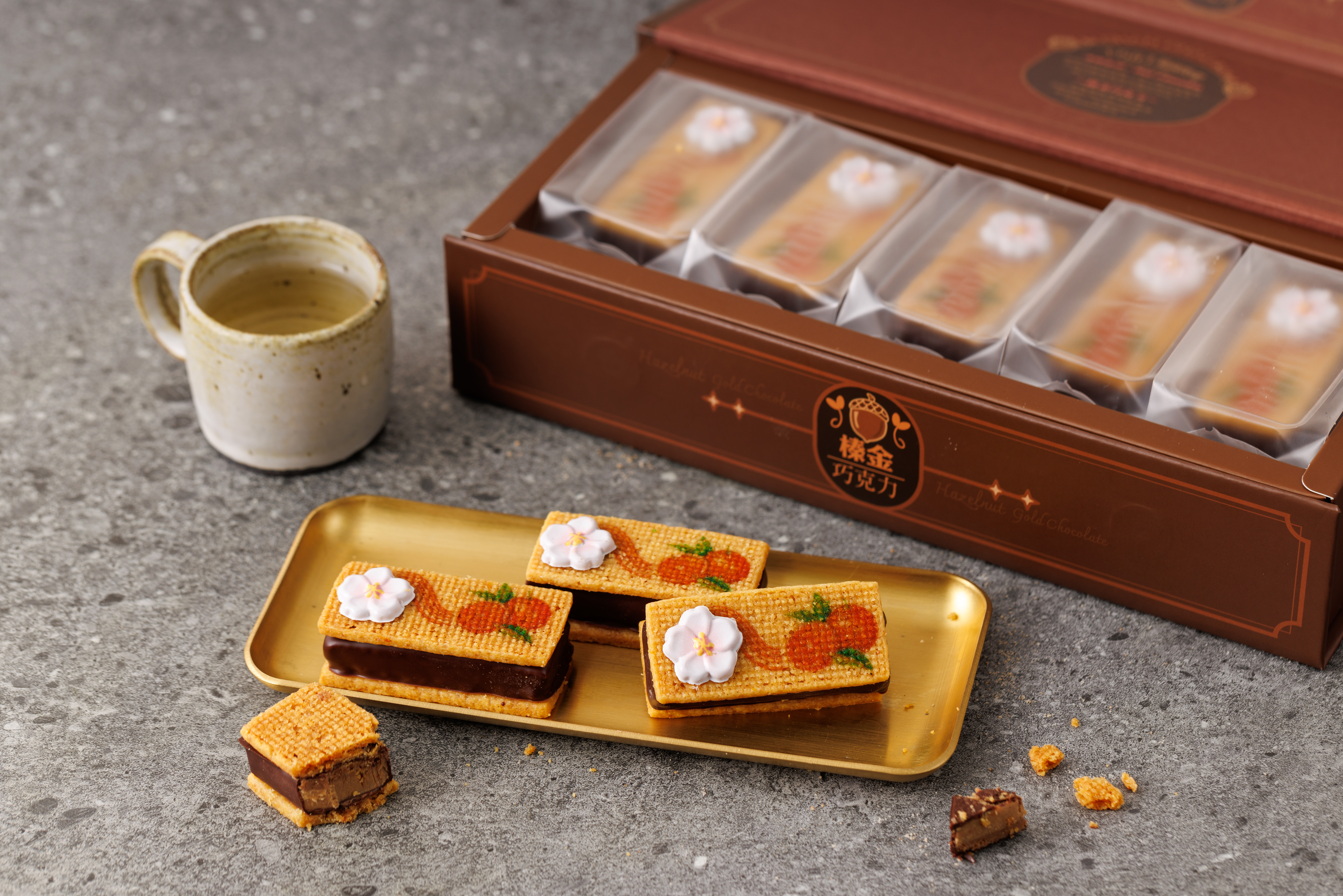 The outer layer is coated with slow-toasted brown rice crisps, adding a light crunch and natural grain fragrance. A three-layer harmony of tea, fruit, and grains, made for international travelers to taste the modern spirit of “tsia̍h-tê.”
