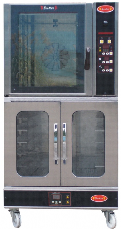 Electric convection oven, 5 trays 40x60cm, Proofer 12 trays. All 6 sides Stainless Steel. Oven temperature controlled by digital touch control panel. Timer alarm for user’s alert of operating timing. Dimension: W76 x D122 x H147.3 cm. Power: 50hz / 380V/3ph+N / 9.5 kw.