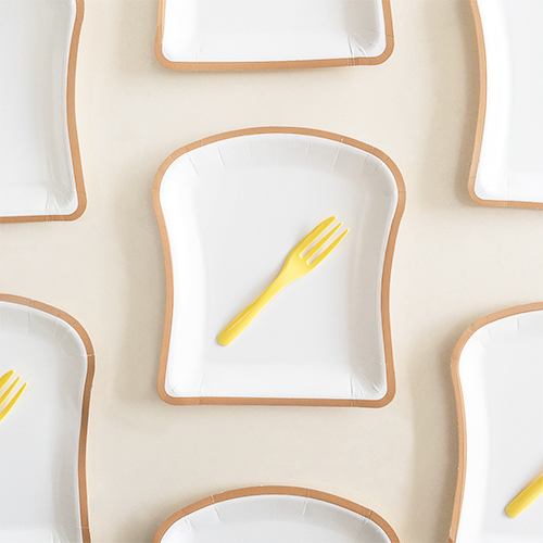 吐司造型蛋糕盤叉組搭配的是黃色法式蛋糕叉,每套6入,100套裝一箱。吐司造型蛋糕紙盤很適合在早餐時段盛裝剛出爐的奶酥厚片,一串吐司盤像極了超市貨架上等待購買的鮮奶吐司,搭配黃色的叉子一起販售,接受客製化包裝哦。
