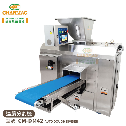 銓麥CM-DM42連續式自動麵團四口/二口分割機,為針對中大克數的麵團分割需求設計,適用於細緻和高黏稠度的麵團組織分割工作。活塞可切換四口與二口功能,不同的分割活塞口徑,搭配本公司其它的烘焙設備,可達成連續且大量的各式麵包及吐司生產線需求。本機麵團含水量介於55%~65%以內的比例,精準且誤差範圍小,有效節省人力與控制生產品質。