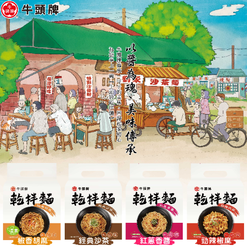 乾拌麵經典沙茶:乾拌麵經典沙茶醬料以魚乾及赤尾青製成,濃郁沙茶讓人口齒留香,麵體嚴選台南關廟麵,堅持手工日曬、非油炸麵體。乾拌麵經典沙茶復刻牛頭牌最初起家的那碗沙茶拌麵,以濃郁沙茶醬和府城關廟麵完美結合,喚醒記憶中的味道。