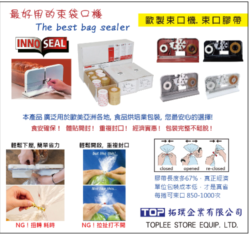 0 毆製束口機 產品分類:包裝設備、包材及禮盒 廠商名稱:拓璞企業有限公司 攤位號碼:J503-1 產品特色 獨特的專利系統將膠帶密封與紙質標籤結合,打造出易於開啟、衛生、防篡改且可重複使用的密封方式。環保、經濟、簡單! 您可能有興趣的產品 鬱金香紙托 美國VIDEOJET電腦日期噴印機,雷射雕刻標示系統,色帶熱轉印機,即印即貼標籤機 橫式高速收縮包裝機 油力士 三軸電腦伺服橫式包裝機 - 皮帶式入料 三軸電腦伺服橫式包裝機 - 往復式端封 20公分抽氣封口機 真空平面袋/卷 日本AND AD4976 脫氧劑包裝金屬異物檢出機 標準款單軸電腦伺服包裝機 SAGA調理紙 ND-C60E 全自動內外袋掛耳咖啡包裝機 多功能自動/手動送袋熱轉印機 REA 大字體噴印機 LX610 桌上型CMY 噴墨標籤印刷機 韓系大數字蠟燭 圓形標籤貼 ND-C60S 超音波內袋掛耳包裝機 開窗蛋糕盒 圓形糖果盒 外抽式真空封口機 ND-C80E 全自動掛耳咖啡包裝機+真空上料機 自動取袋-充填-封口包裝機 REA JET 高解析噴印機 日日福圓筒盒 人氣產品專區 氣炸鍋專用烘焙紙 《萬年春》日本焙茶粉100g Breville 智慧型半自動義式咖啡機 餅乾造型蛋糕盤叉組 奶油切割盒(200g/450g) 日本日清麵粉 蛋糕紙托(金銀耳盤) HM-200 新電動攪拌機 5200XL 萬用食物處理機 真空包裝機|四款 Charming 喬名巧克力 『堅果可可』單盒賣場區 宜蘭餅 非籠飼紅殼蛋 豆漿袋 萬用過濾袋 純棉過濾袋 芋泥流心酥 連珍芋頭牛奶 連珍芋頭球 草莓優格餡 密封多層式三次元震動篩粉過濾機 高效能無聲震動過濾機 12公升 最小型卡士達攪拌機 12公升電磁攪拌機 150公升 自動傾倒+自動上升 加熱攪拌機 麻糬蒸熟+揉合攪拌機 80公升 中小型卡士達加熱攪拌機 12公升瓦斯攪拌機 40/80公升 鍋子電動傾倒加熱攪拌機 28公升瓦斯攪拌機 10公升攪拌機 12公升觸控攪拌機 回列表
